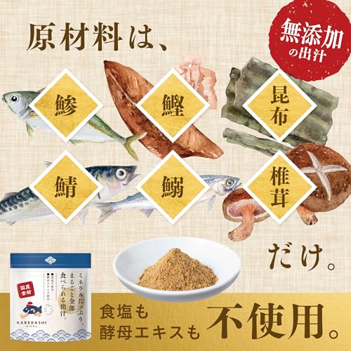 原材料は、国産の鰹節、いわし煮干し、真昆布、椎茸のみ。食塩も酵母エキスも一切加えていません。まさに「お母さんの手作り」に近い純粋な粉末です。袋を破って丸ごと食べることも推奨されており、一物全体の養生に最適です。