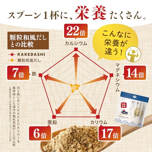 原材料は、国産の鰹節、いわし煮干し、真昆布、椎茸のみ。食塩も酵母エキスも一切加えていません。まさに「お母さんの手作り」に近い純粋な粉末です。袋を破って丸ごと食べることも推奨されており、一物全体の養生に最適です。