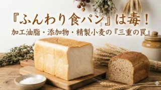 毎朝、手軽にトーストしているその白い、柔らかい食パン。多くの方はそれを「美味しい朝食」と信じていますが、その裏には、家族の命を脅かす三重の毒が隠されています。この「ふんわり感」は、自然の恵みではありません。 第一の毒:血管を詰まらせる「加工...
