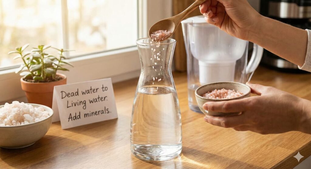 浄水器の水に天然塩を戻すという小さな習慣。それは、現代生活の中で乾ききったあなたの細胞に、生命の源である「海」を還してあげる、慈しみ深い儀式です。効率や清潔さの先に忘れ去られてしまった「生命の理(ことわり)」を、コップ一杯の水から取り戻しましょう。
